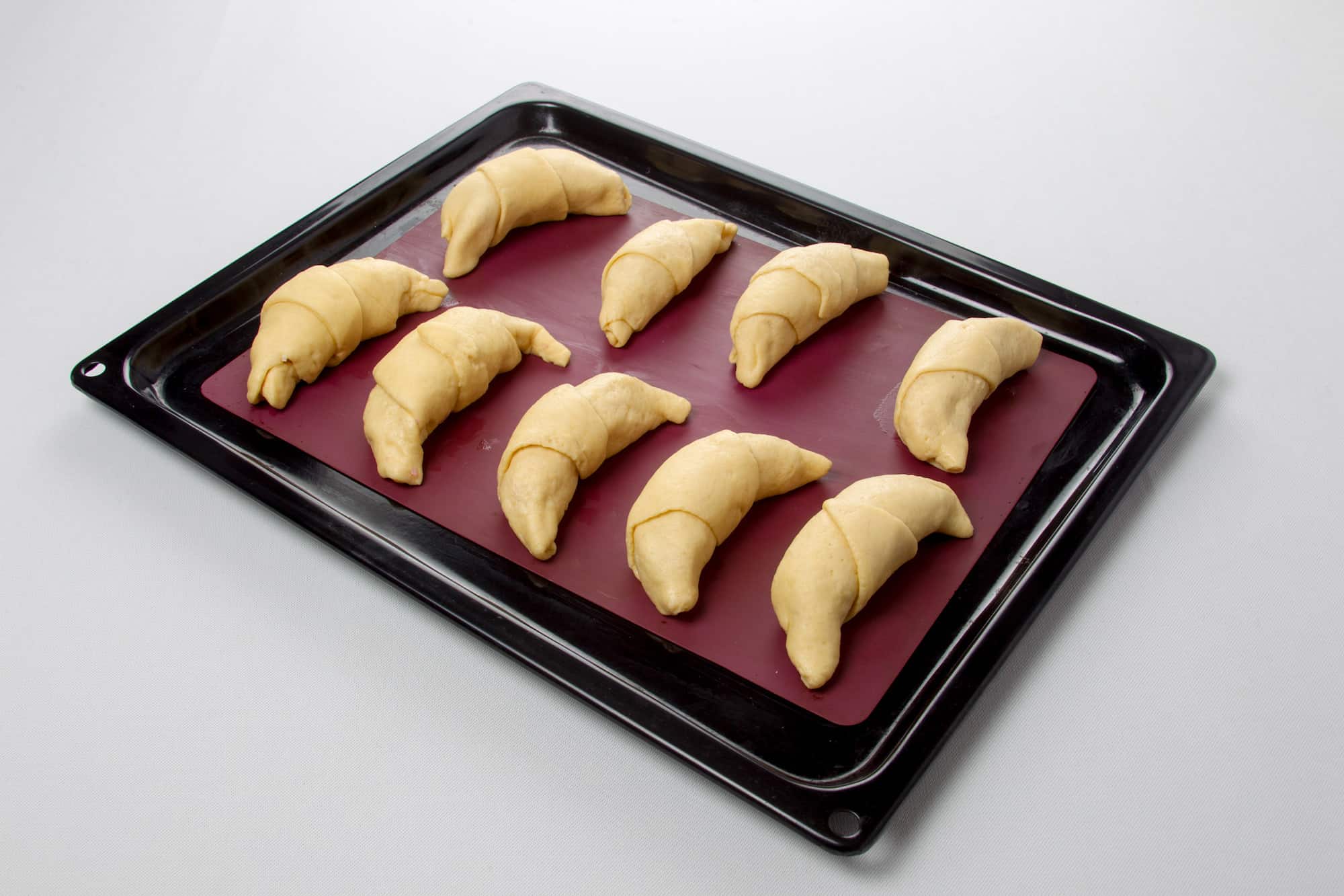 Preparar una bandeja para hornear, cubriéndola con papel parafinado o una manta de silicona para hornear y coloque los croissants sobre ella.