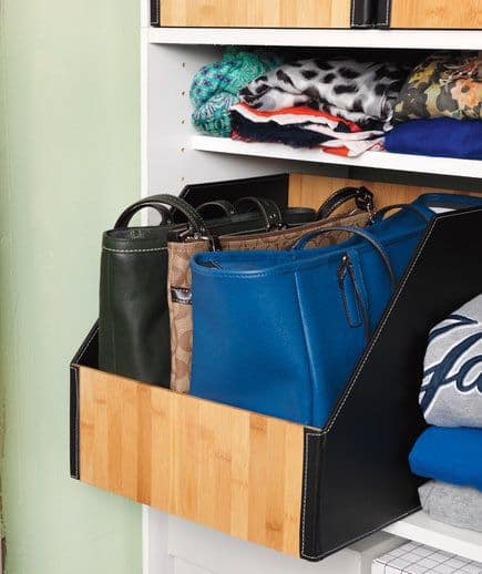 La forma más fácil pero que también ocupa más lugar es la de colocar tus bolsos y carteras en estantes. Si tienes menos espacio, puedes colocarlos de costado para optimizar cada estantería. Agrega separadores para organizar carteras pequeñas y sobres.